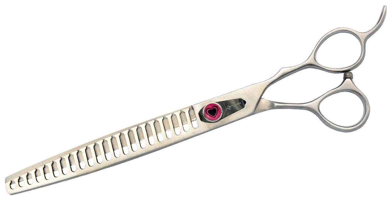 Kenchii’s top performance value grooming shears! Fully forged and hand-honed Japanese alloy steel with custom non-slip micro-serrated semi-convex edge. Love models are made with offset handles for comfort and finished with rustproof satin.